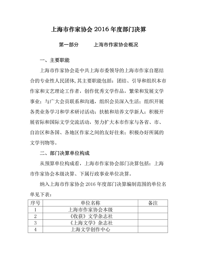 第一部分 上海市作概況家協會 一、主要職能 上海市作家協會是中共上海市委領導的上海市作家自愿結合的專業性人民團體,其主要職能包括:團結......