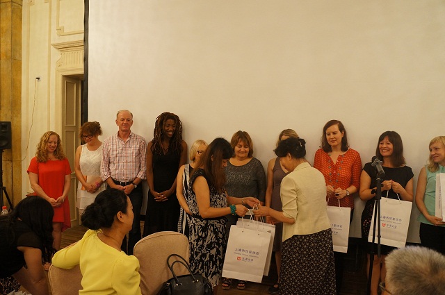 上海作協(xié)黨組書記、副主席汪瀾向10位駐市作家贈(zèng)送上海作家作品英文版。