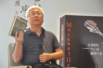 鄭體武教授先從知人論世的角度,簡單介紹了葉羅費耶夫生平及其作品《從莫斯科到佩圖什基》。他還拿來本世紀初俄羅斯出版的一本《從莫斯科到佩圖什基》的注釋版,“原文僅105頁,而注釋篇幅竟長達400多頁。”他解釋道,全書看似醉酒的語言中,盡是典故、隱射,涉及到的俄國各時期作家就有五十個左右,更有俗語、黑話,甚至還有臟話,中文版引進時已經做了相應的處理。